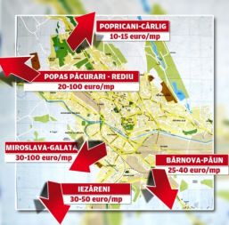 Si in sud-vestul orasului, terenurile din comuna Barnova, situate in spatele restaurantului Onyx, unde metrul patrat se vinde cu preturi cuprinse intre 25 si 40 de euro, sunt bine cotate pentru dezvoltarea unor zone rezidentiale.
